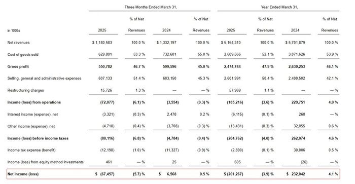 安德玛上一财年出现亏损 图源:财报